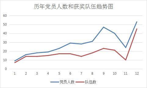 3. 历年党员人数走势和获奖人数基本保持一致,说明党员对数学建模的影响作用凸显。