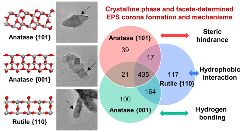环境中的纳米颗粒(NPs)会与周围环境中的大分子相互作用,在其表面形成生态冠(eco corona),进而影响纳米颗粒的环境命运和毒性。含有大量微生物胞外聚合物(EPS)的污水处理厂是向环境中排放 NPs 的重要来源,因此,研究NPs表面 EPS 冠的形成至关重要。该项研究以广泛使用的TiO2 NPs为代表,考察了三种具有不同晶型和晶面的 TiO2 NPs上 EPS 冠的形成。研究发现不同类型TiO2 NPs上EPS冠的蛋白质类型和丰度各异,这些由选择性吸附引起的差异主要取决于TiO2 NPs与蛋白质之间的空间位阻、氢键和疏水作用,而以上作用又受到晶型和晶面引起的TiO2 NPs聚集状态、表面羟基密度和疏水性变化的影响。此外,晶型和晶面引起的 EPS 冠的变化进一步改变了 TiO2-EPS 冠复合物的聚集状态和氧化潜势。该项研究强调了晶型和晶面在纳米颗粒环境行为中的重要作用,可为纳米颗粒的安全设计提供启示。