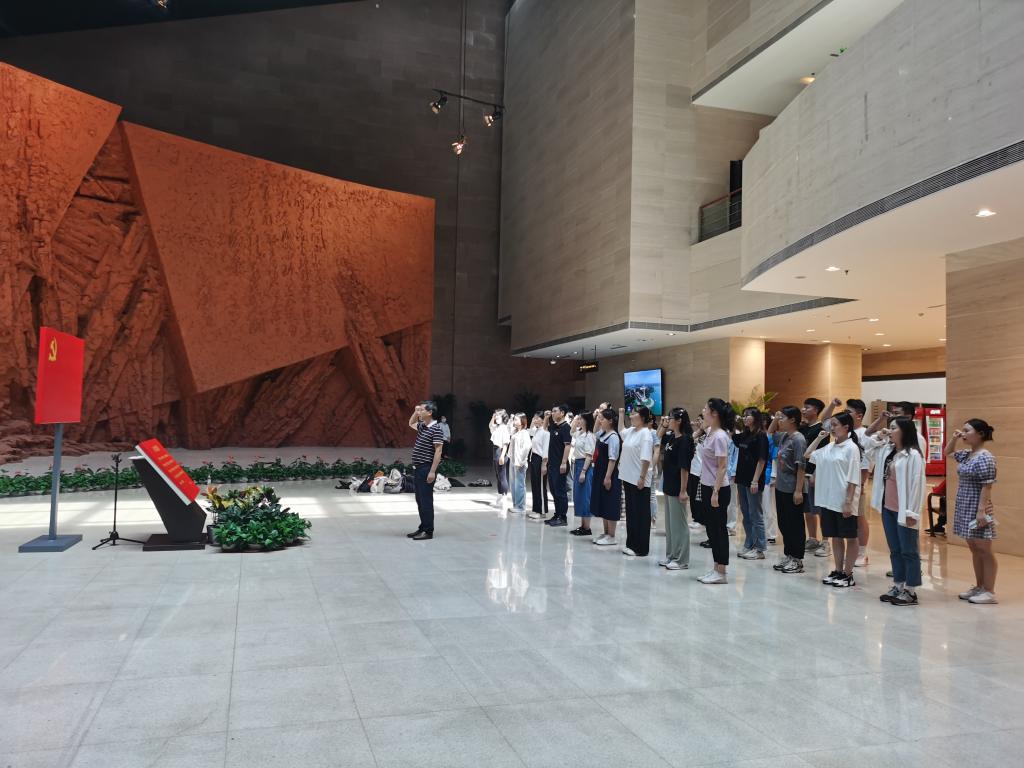 师生依次参观了渡江战役纪念馆的战前形势、战役准备、突破江防、战役胜利、人民支前、英烈伟迹等6个展厅。一件件历史文物、一幅幅革命影像、一段段感人肺腑的故事,再现了72年前渡江战役的艰难险阻和400万军民奋勇南渡的壮阔画面,带领大家走进了百万雄师过大江的历史长河,感受到渡江战役胜利的来之不易,体会到“渡江战役胜利是靠老百姓用小船划出来的”深刻内涵。在渡江战役纪念馆序厅,面对鲜艳的中国共产党党旗,夏业鲍带领大家重温入党誓词。