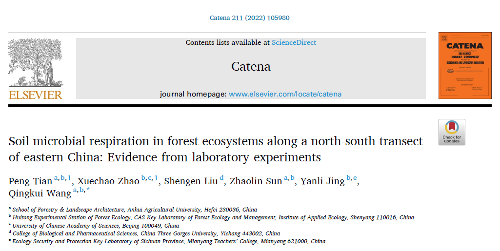 近日,安徽农业大学林学与园林学院林学系青年教师田鹏在自然科研旗下期刊Communications Earth & Environment和中科院一区top期刊Catena接连发表题为“Past climate conditions predict the influence of nitrogen enrichment on the temperature sensitivity of soil respiration”和“Soil microbial respiration in forest ecosystems along a north-south transect of eastern China: Evidence from laboratory experiments”的科研论文,系统阐述了古气候对全球变化背景下土壤碳释放的遗留效应及土壤微生物呼吸沿中国东部南北样带的空间异质性及其调控因子。研究结果将有助于提高我们在地球系统模型中预测土壤CO2通量的准确性,为进一步丰富和细化土壤碳-气候模型提供数据基础和理论支撑,并最终服务于国家“碳中和”总体行动目标。