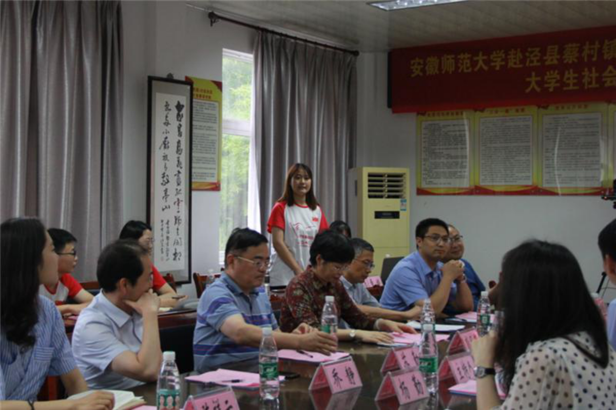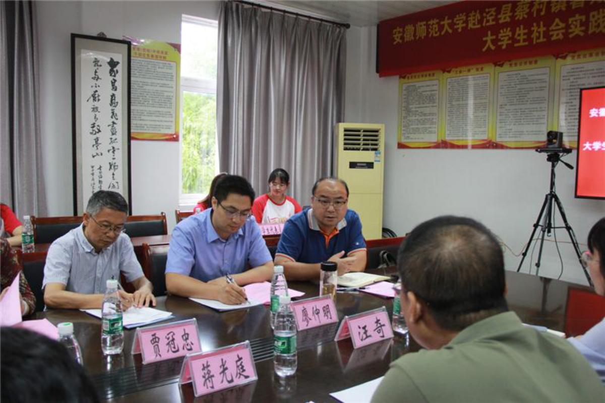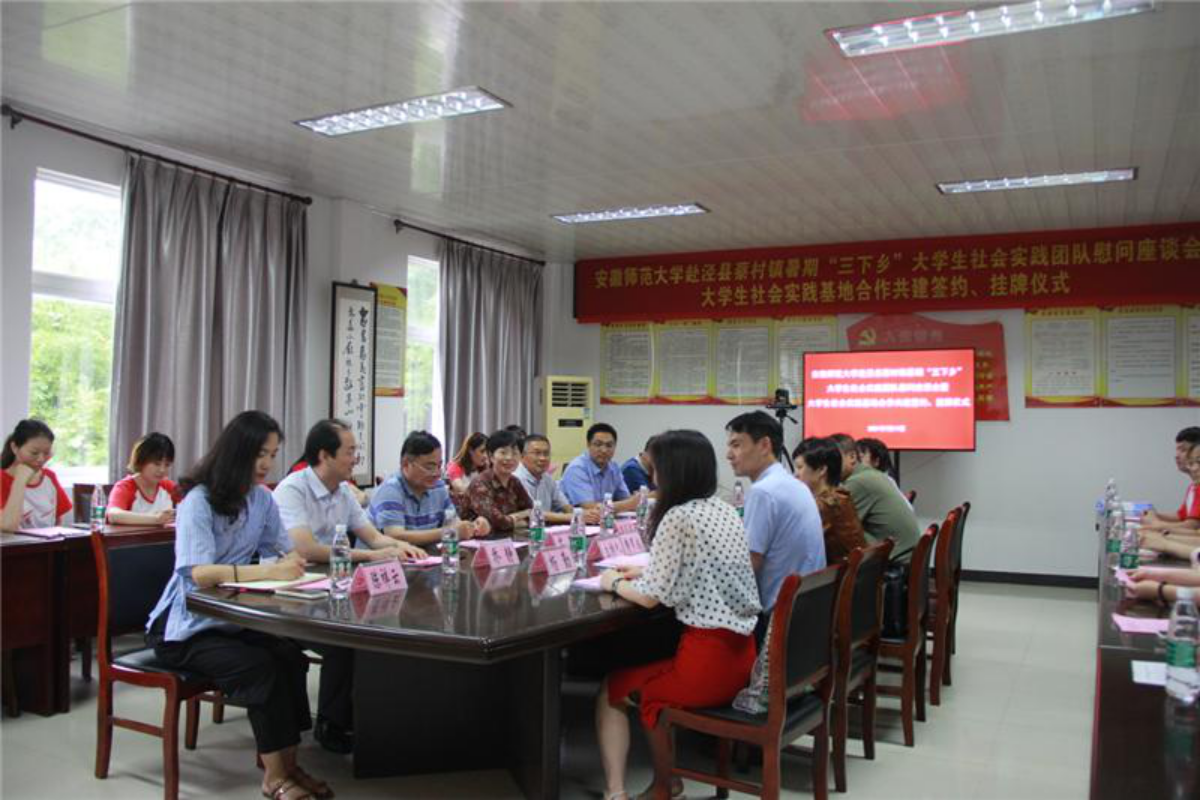 7月17日下午,副校长彭凤莲、校团委副书记廖仲明在地旅学院党委书记贾冠忠,院长苏勤,党委副书记乔静及旅游管理专业负责人、博士生导师杨钊教授的陪同下,来到泾县蔡村镇,亲切慰问地旅学院赴皖南川藏线农户生计调研实践团队的全体队员,泾县人民政府副县长张素兰、费罗成,蔡村镇党委书记蒋光庭、党委组织委员汪奇,泾县团县委副书记杨勤等同志热情接待了彭凤莲一行,并举行安徽师范大学赴泾县蔡村镇暑期“三下乡”大学生社会实践团队慰问座谈会暨大学生社会实践基地合作共建签约、挂牌仪式。活动由泾县人民政府副县长、我校地理与旅游学院挂职干部费罗成主持。