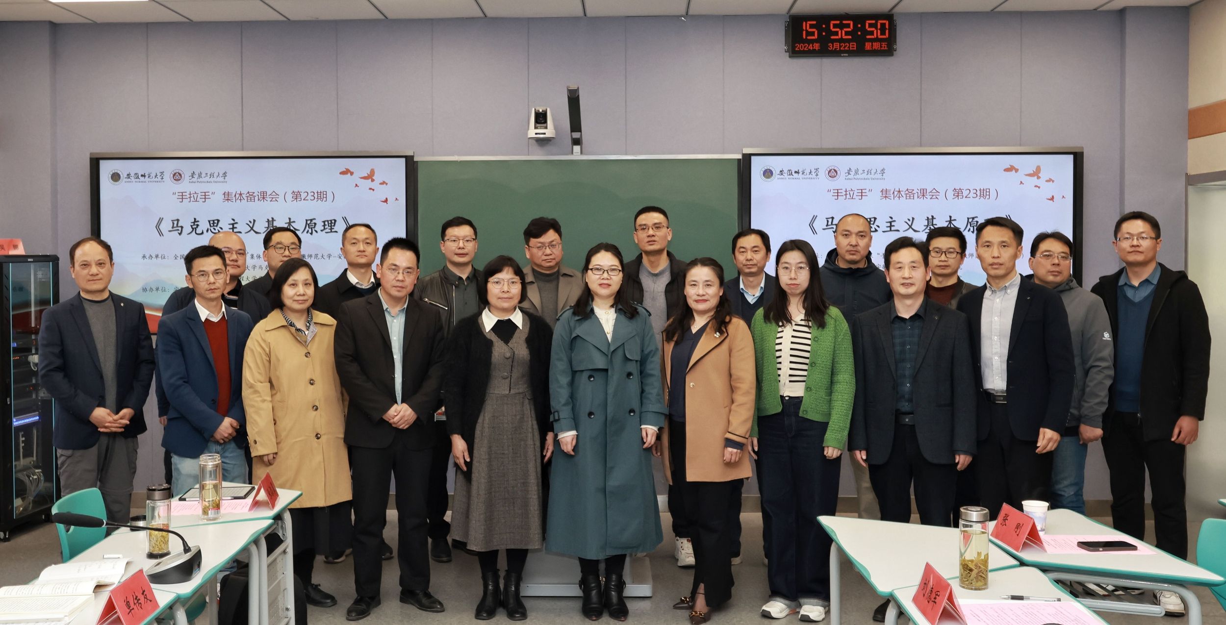 3月22日下午,全国高校思政课“手拉手”集体备课中心(安徽师范大学—安徽省)在安徽工程大学举行第23期集体备课会。备课会由安徽师范大学马克思主义学院与安徽工程大学马克思主义学院共同承办、安徽省高校思想政治理论课教学指导委员会“原理”课分教指委协办。安徽省高校思政课教指会“原理”课分教指委主任委员、合肥工业大学马克思主义学院院长牛小侠、安徽工程大学马克思主义学院院长吴月红、副院长刘德军、李海涛、全国高校思政课“手拉手”集体备课中心负责人、安徽师范大学马克思主义学院副院长汪盛玉全程参与指导。安徽师范大学马克思主义学院、安徽工程大学马克思主义学院“原理”教研室共计30余位教师参加了集体备课会。备课会由安徽师范大学马克思主义学院“原理”课程组负责人单传友主持。