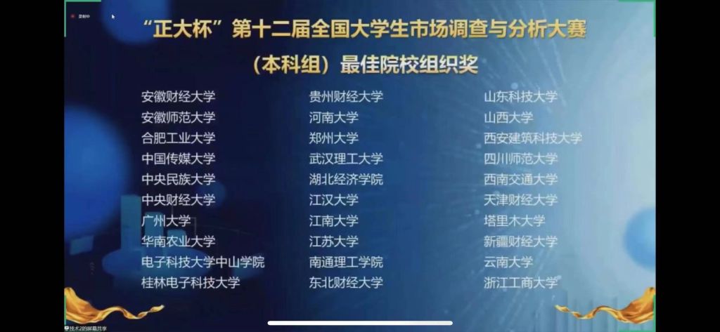 2022年5月28-29日,“正大杯”第十二届全国大学生市场调查与分析大赛圆满落幕。经过省赛及复赛的层层选拔,全国共有211支队伍进入本科生组总决赛,安徽省共有14支团队入围本次决赛。由党支部成员-2019级数学与应用数学(师范类)拔尖班王小如、石子怡等组成的网易云音乐队荣获第十二届全国大学生市场调查与分析大赛国家一等奖,这是我校在该赛事再次获得国家级一等奖,同时,也是我校第四次荣获最佳组织奖。