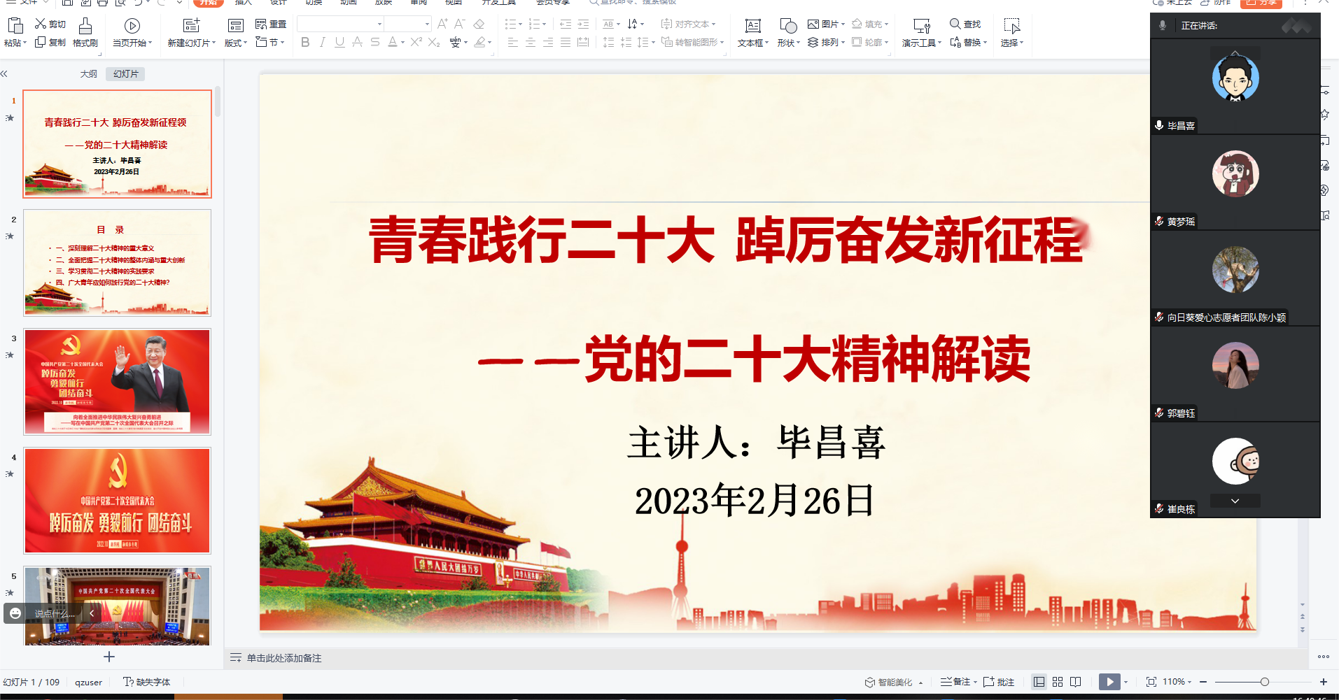 为全面推进学习宣传贯彻党的二十大精神,广泛深入开展党的二十大精神理论宣讲,2月26日下午,数统学院通过腾讯会议APP线上开展院团委书记上学习宣传贯彻党的二十大精神专题党课活动。党课由院团委书记、数学与应用数学专业本科生第二党支部书记毕昌喜主讲。