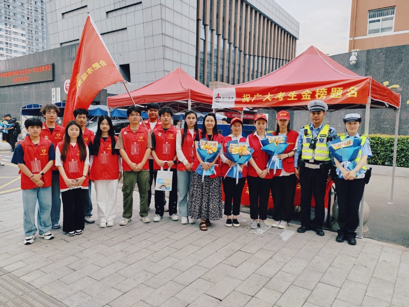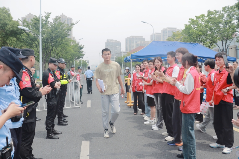 高考现场,大学生志愿者们身穿红马甲在入口两侧为考生建立起绿色通道,配合交警维持交通秩序,进行安全疏导,确保接送考生的车辆顺畅、安全通行;他们还与城管队员合作,进行文明引导和秩序维护,提醒送考的家长保持秩序、降低声音,从而为考生营造了一个安静有序的外围环境。大学生志愿者还为现场的交警、城管、医护人员等后勤保障人员提供了矿泉水和防暑降温物品。此外,他们还在考点附近搭建了爱心帐篷和服务台,为广大考生和家长们免费发放印有学院标志的高考助力帆布袋、扇子和矿泉水等物品,并为等候的家长们提供临时休息场地,全方位保障考生和家长的需求。在考生出来之际,志愿者们以饱满的热情和甜美的笑容迎接考生,为其准备下一科考试加油。