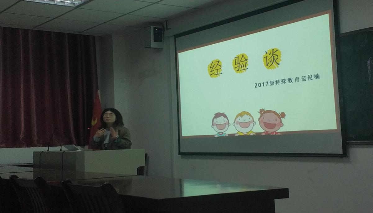 4月15日,特殊教育专业在J305开展本科生学习经验分享交流会。会议邀请了2017级特殊教育专业范俊楠、冯子贵两位同学做学习经验报告,特殊教育专业部分教师和全体在校本科生参加了交流会。