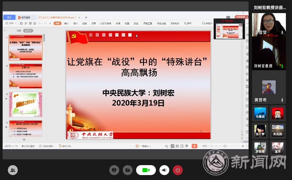 如何开展疫情期间的党支部学习活动,是所有党支部在特殊时期面临的新课题。在举国“战疫”的特殊时期,建艺学院艺术设计系教工党支部、实践教学部教工党支部积极行动,充分利用网络资源,与中央民族大学马克思主义学院教工第一党支部举办全国样板党支部携手共建活动,邀请刘树宏教授于3月19日下午进行了一场别开生面的网上“战役”讲座。校纪委书记马春成,建艺学院负责人、系主任等参加了学习。