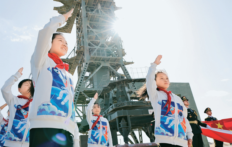 少先队是建设社会主义和共产主义的预备队。广大少先队员在少先队这所大学校里立志向、修品行、练本领,从小培养热爱党、热爱祖国、热爱人民的情怀,展现出朝气蓬勃的精神风貌。2024年4月24日是第九个“中国航天日”,“红领巾爱祖国——我心中的五星红旗”主题活动在中国酒泉卫星发射中心东方红卫星发射场举行。图为当日,来自内蒙古、甘肃、四川等地的少先队员在中国酒泉卫星发射中心东方红卫星发射塔架下敬队礼。 新华社记者 金立旺/摄