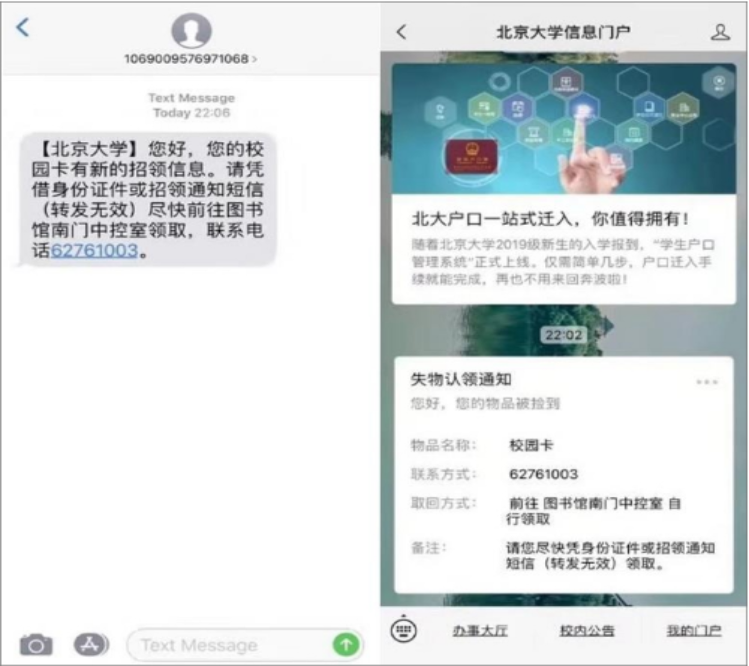 校园卡招领系统“一条龙”服务,微信和短信提醒领取地点