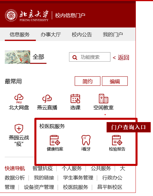 2021年6月,计算中心配合校医院上线了在门户上查询检验报告以及学生在自助机上办理疫苗接种证明的功能。师生们足不出户就可以轻松查到自己的检查报告,学生们还可以在校园中任意一台自助机上打印出自己的疫苗接种证明。