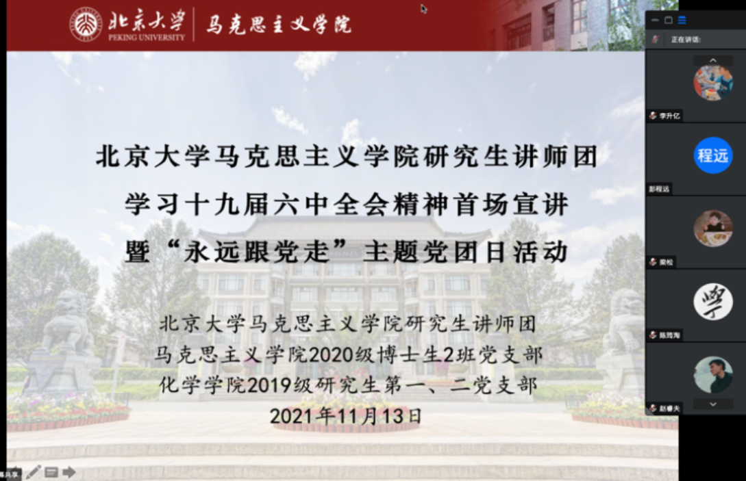2021年11月8日至11日,中国共产党第十九届中央委员会第六次全体会议在北京召开。这次全会是在我们党百年华诞的重要时刻,在“两个一百年”奋斗目标历史交汇关键节点上召开的一次重要会议。为深入学习领会党的十九届六中全会精神,贯彻落实《中共中央关于党的百年奋斗重大成就和历史经验的决议》的相关学习,引领广大党员同志和团员青年坚定“四个意识”,把握“四个自信”,做到两个维护,11月13日14:00,北京大学马克思主义学院研究生讲师团联合马克思主义学院2020级博士生2班党支部、化学与分子工程学院2019级研究生第一、第二党支部,共同开展学习十九届六中全会精神首场宣讲暨“永远跟党走”主题党团日活动。马克思主义学院副院长、研究生讲师团指导教师宋朝龙,党委副书记李石生,博士后易佳乐、陈筠淘,团委书记曾格子出席活动。来自马克思主义学院研究生讲师团、马克思主义学院2020级博士生2班党团支部以及化学与分子工程学院2019级研究生第一、第二党支部的七十余位同学参与本次活动。因疫情防控需要,本次活动于腾讯会议线上进行,由马克思主义学院研究生讲师团团长陈晓仪同学主持。