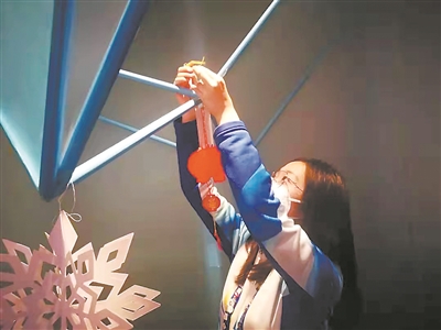 北大志愿者李嘉馨在布置冬奥场馆休息室。资料图片