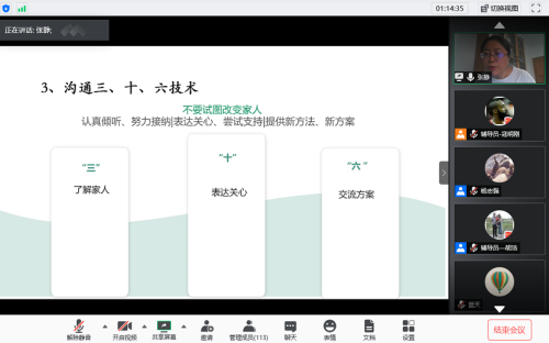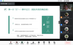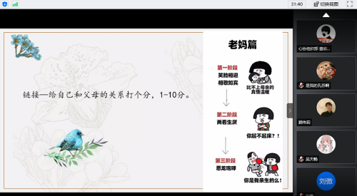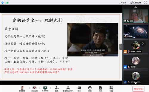 讲座中,张老师还先后邀请了心理中心戴妍妍老师从父母的角度分享了“孩子和父母生活方式的不同”;杨志强副书记从爸爸的角度分享了宅家学习期间与女儿相处的故事。