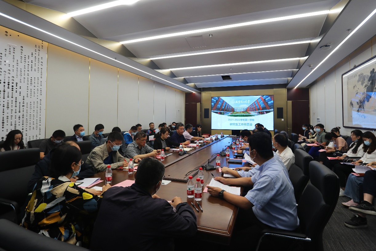 研究生院和党委研工部分管领导分别就新学期招生、培养、学位、学科、党建思政和日常管理等各项工作要点做了详细介绍。一是强化制度建设,完善工作程序,做好接收推免生招生工作;加强组织领导,严把关键环节,确保2022年全国硕士研究生招生考试安全平稳。二是优化研究生培养过程,强化研究生分类培养;完善研究生课程体系,规范研究生教材管理;加强培养过程管理,持续提升研究生教育国际化水平。三是强化过程质量监督,保持学位授予高质量;完善学位授予评价标准,推进质量保证体系建设;加强导师岗位管理,发挥导师立德树人作用。四是统筹做好学科评估及专业学位水平评估后续工作;提升学位与研究生教育质量,做好学位授权点合格评估。五是持续做好常态化疫情防控和安全稳定工作,加强研究生党员教育培养力度,加快构建以专为主、专兼结合的研究生辅导员队伍,依托“立根铸魂家国梦、立志立言报国行”示范基地全面加强研究生科学道德和学风建设。