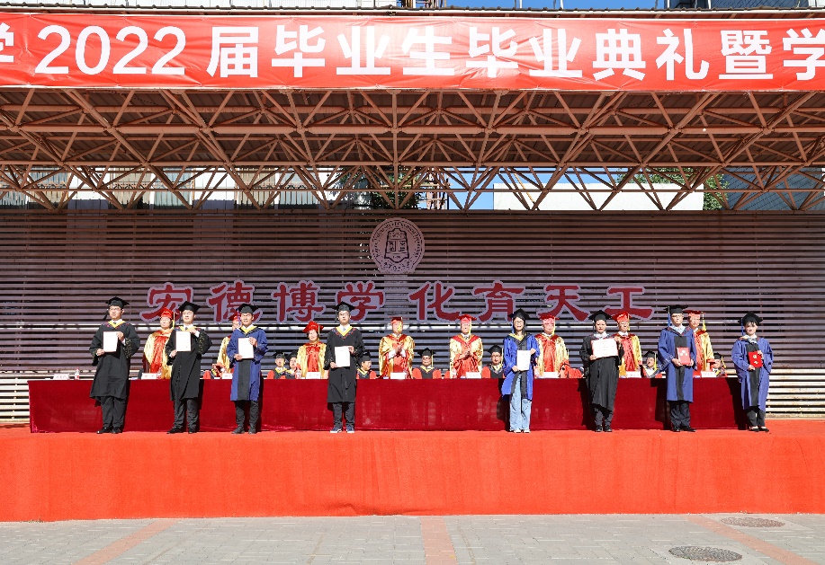 毕业典礼结束后,校领导及各学院领导、教授为获得硕士、学士学位的毕业生拨穗正冠、颁发学位证书。