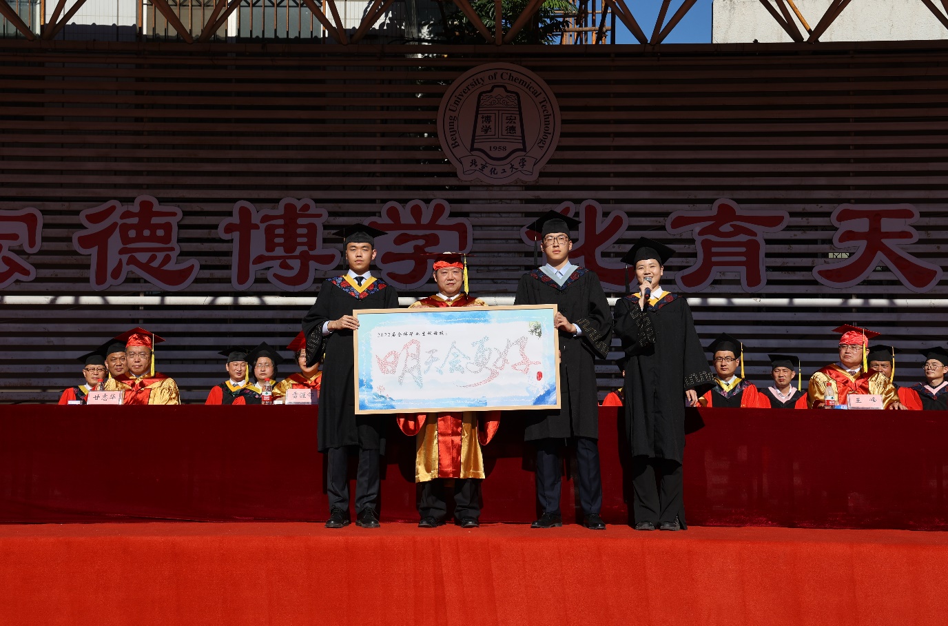 校党委书记刘贵芹代表学校接受2022届毕业生代表向母校赠送的毕业纪念品。纪念品是由全体2022届毕业生姓名拼写而成的“明天会更好”的拼图。“明天会更好”饱含了2022届毕业生对母校的真挚祝福,同时也是对母校的庄严承诺。相信母校在一代代北化人的共同努力下,明天一定会更加美好;相信2022届广大毕业生带着师长们的谆谆教诲和刻在骨子里的“北化印记”,无论走到哪里,他们的明天一定会更加精彩非凡。