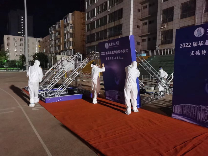 在夜间搭建毕业季景观,工作人员全部着防护服