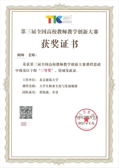 8月18至22日,由教育部高等教育司指导、中国高等教育学会主办的第三届全国高校教师教学创新大赛在浙江大学落下帷幕。北京建筑大学建电系本科生党支部书记阚帅教师团队在比赛中表现优异,获课程思政中级及以下组全国三等奖,为我校教师首次获得此项赛事全国赛奖项,实现历史性突破。