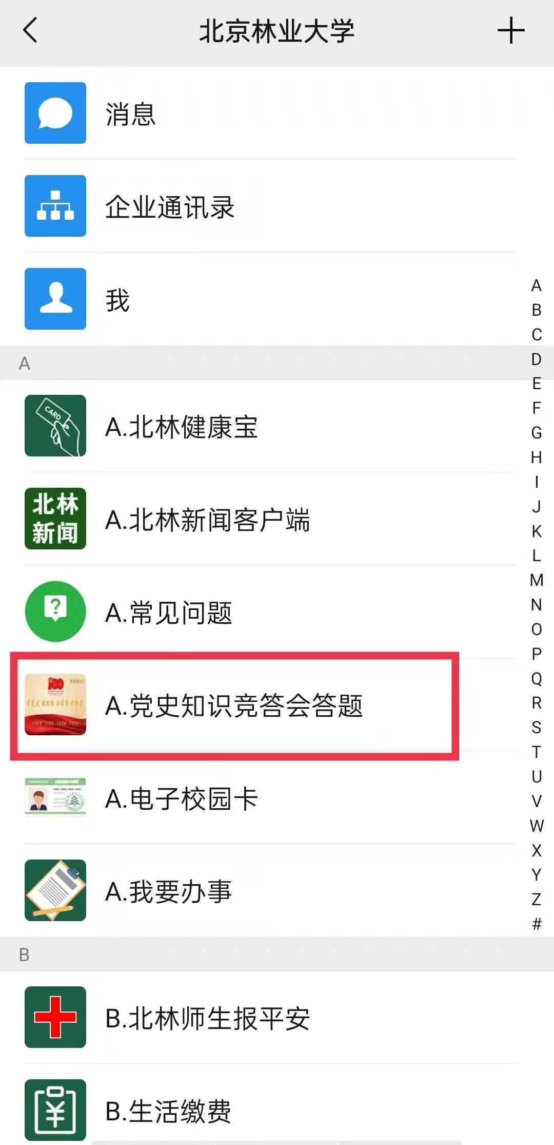 此次竞答会创造性地采用线上答题和现场竞答相结合的全新模式。初赛启动后,校园新闻网第一时间进行了宣传,数字校园每户向每名北林师生发布了通知,各院(系)级党组织通过支部路径向全体党员发布了通知。全校师生均可通过电脑、手机等媒介,随时随地登陆“北京林业大学”企业号线上答题。测试题目由系统随机抽取,每人每次答题需完成30道题目,其中包括20道选择题和10道判断题,系统根据答题的正确率打分,每次答题题目由系统随机抽取产生,备选答案随机排序。开放测试时间内,每人可最多进行10次测试,最终保留最高成绩。校领导带头参加线上答题,有的师生把初赛的线上答题作为自我督促开展党史知识学习、检验自己学习成效的有效手段,共有236名师生充分利用答题机会进行了10次测试,不断巩固知识、提高成绩,校园里人人答题的氛围逐渐浓烈。