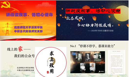 在迎来中国共产党成立99周年,北京市新冠肺炎疫情防控形势持续向好,全国新冠肺炎疫情防控取得重要成果之际,2020年7月8日上午,北京师范大学历史学院中国古代史教师党支部与2018级硕士生党支部联合开展“讲战疫故事,悟初心使命”主题党日活动。活动采用腾讯会议平台进行,师生党员共计40余人在线参与。本次活动,由中国古代史教师党支部书记陈涛和2018级硕士生党支部书记李智豪主持,师生围绕“讲战疫故事,悟初心使命”这一主题,共同分享了疫情影响下开展教学科研、居家学习工作、参与志愿服务等方面的故事和心得。