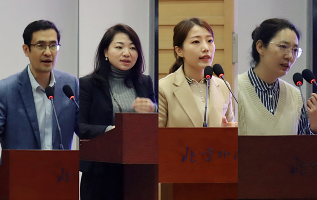 来自中国人民大学马克思主义学院的宋友文教授以及北外马克思主义学院的张曼、刘菁、韩雪青三位教师分别进行了说课展示。宋友文以“如何培养理论思维?——读原著、学原文和悟原理”为题,从什么是理论思维、培养理论思维为何重要、怎样培养理论思维三个方面生动讲述了如何引导学生认清社会发展大势,做到理论上清醒,政治上坚定。张曼以《马克思主义基本原理》第三章第三节《人民群众在历史发展中的作用》的教学为例,围绕人民群众概念辨析、辩证看待人民群众创造历史过程中的作用等问题,展示了从案例导入、理论分析到拓展总结的教学过程。刘菁以《思想道德与法治》课教学中的社会热点为切入点,示范了如何通过社会热点事件和案例来引导学生正确认识中国特色社会主义法治道路和树立法治思维,并展示了自己在丰富思政课教学方法方面所作的尝试。韩雪青以《毛泽东思想和中国特色社会主义理论体系概论》课中“发展社会主义民主政治”为主题,围绕民主是社会主义的生命、坚持走中国特色社会主义政治发展道路、健全人民当家作主制度体系这三个层面展开理论阐释,落脚于坚定对中国特色社会主义政治制度的自信。