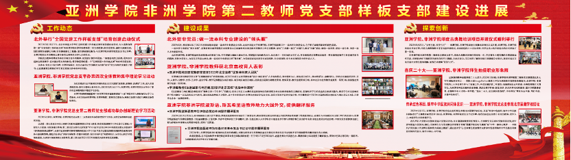 北京外国语大学亚洲学院非洲学院第二教师党支部自2022年3月起获批第三批全国党建工作样板支部培育创建单位,认真学习贯彻习近平新时代中国特色社会主义思想主题教育,落实立德树人根本任务,致力于打造“亚非非通用语基层组织工作平台和育人载体”。