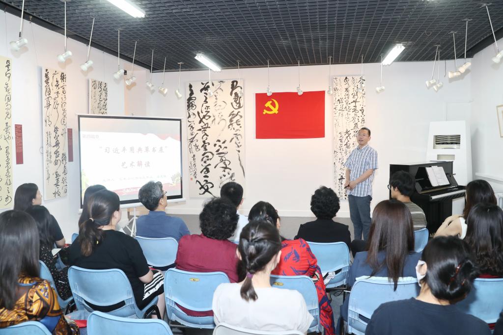 艺术学院书法专业负责人梁文斌副教授对正在展厅展出的“习近平用典草书展”进行艺术解读。这次书法展在内容方面,以习总书记讲话中的用典为主要题材,在形式上用草书来创作此次展览,草书的洒脱豪迈、形式多样,和波澜壮阔的百年党史、开天辟地的伟大事业相得益彰。展厅中间以楷书小册页的形式书写艺术学院师生“对党说句心里话”,则体现了庄严庄重的情感。两部分作品均由书法专业的师生共同创作,点明了“学史明理,学史增信,学史崇德,学史力行”的党史学习主旨。