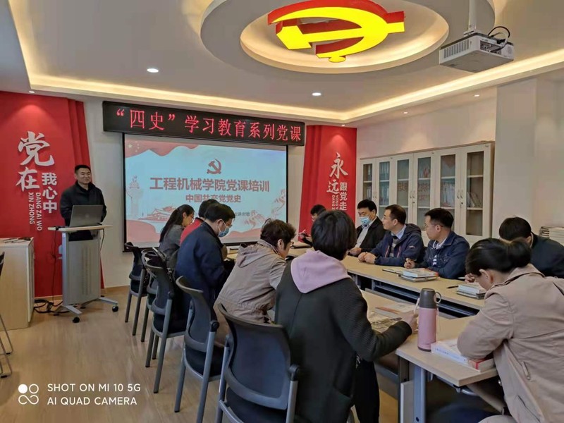 2021年4月28号下午,工程机械学院教工第六党支部党员教师在党建活动室开展了“四史”学习教育系列主题活动,学院党委委员、副院长叶敏教授以“中国共产党党史”为题从新民主主义革命、社会主义革命和建设、社会主义现代化建设三个阶段为教工第六党支部全体党员同志们生动地讲授了党的发展历史和重要事件。本次党课由党支部书记贺朝霞老师主持。