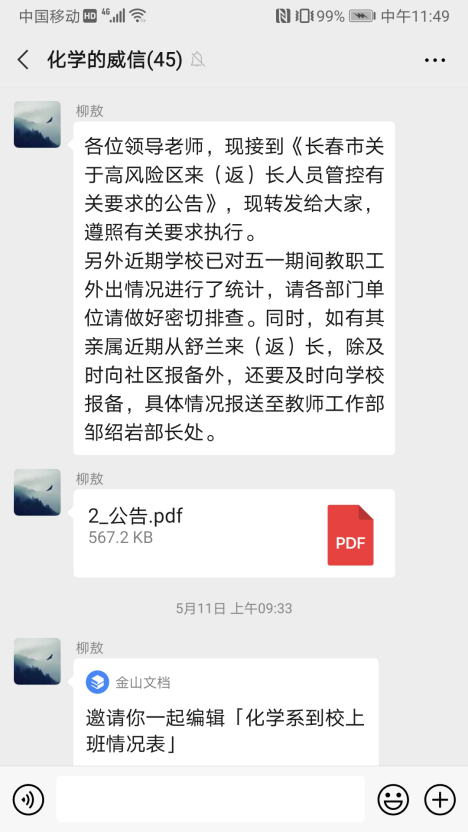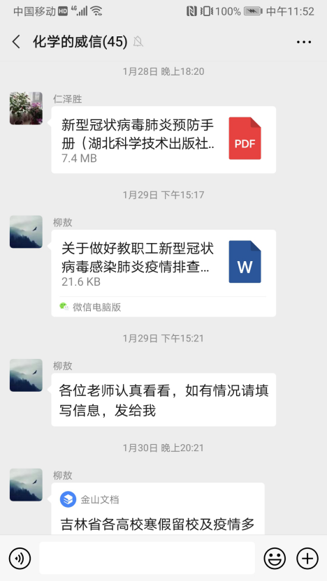 疫情爆发初期,为缓解广大师生因对疫情不了解而产生的恐慌,党支部在工作群第一时间发布《新冠疫情病毒肺炎预防手册》,帮助师生了解什么是新冠病毒肺炎,病毒如何传播,如何科学有效地进行预防。及时了解化学系师生动向,做好疫情排查工作。近期吉林市突发疫情,化学系高度重视,党支部严格执行上级主管部门有关疫情管控的工作部署,排查高风险地区返长人员的,每天统计到校上班的职工名单,对有过吉林市出行记录的教师,督促其要严格执行居家隔离。