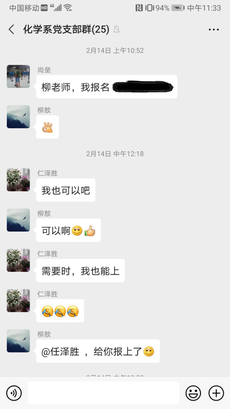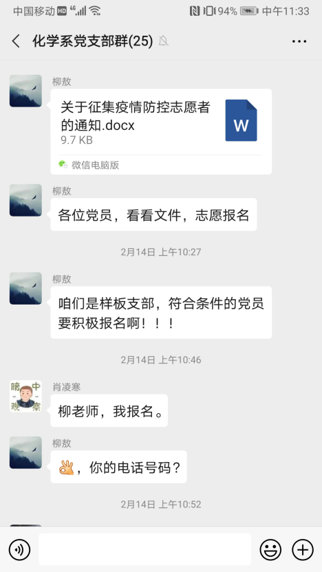 2月初,全国疫情形势严峻,为坚决做好疫情防控工作,防止疫情向学校扩散、守护师生健康、维护校园稳定,学校疫情防控工作领导小组决定面向全校教职工征集疫情防控志愿者。化学系九名党员积极响应号召,踊跃报名,加入工大战疫先锋队。