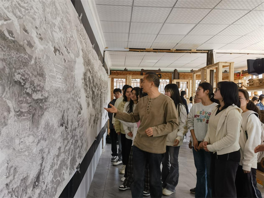木雕馆里一幅25米长的《湘行散记》绘画水墨稿完整的展示在墙上,“我花了4年时间完成,展现了河街码头、凤凰古城昔日的繁荣景象以及一脚踏三省的边城。”潘老师认真讲解着他的创作理念,深深吸引了参观学生。