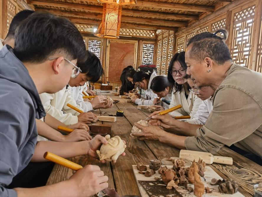 学院自2020年以来,以非遗进校园、文化寻访、非遗文创体验等系列主题活动推进开展“非遗”传承教育工作,并于2024年开办非遗木雕兴趣班,形成以“教师为主导、学生为主体、非遗传承人为支撑”的教学模式,受众师生近万人,成效显著。