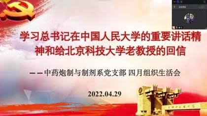 2022年4月30日下午,药学院中药炮制与制剂党支部召开主题党日活动共同学习习近平给北京科技大学的老教授回信和习近平总书记在中国人民大学考察时的重要讲话精神,党支部21名党员一起在线上参加了此次“云党日活动”。党支部书记章津铭首先对此次党日活动的主题、流程和意义进行介绍。此次党日活动紧扣习近平总书记给北京科技大学的老教授回信和在中国人民大学考察时的重要讲话精神,对培养更多高素质人才提出殷切期望的重要主题,结合本学科的特色,重点围绕中药炮制与制剂学科融入思政元素的重要性、方式方法和实践过程等展开。