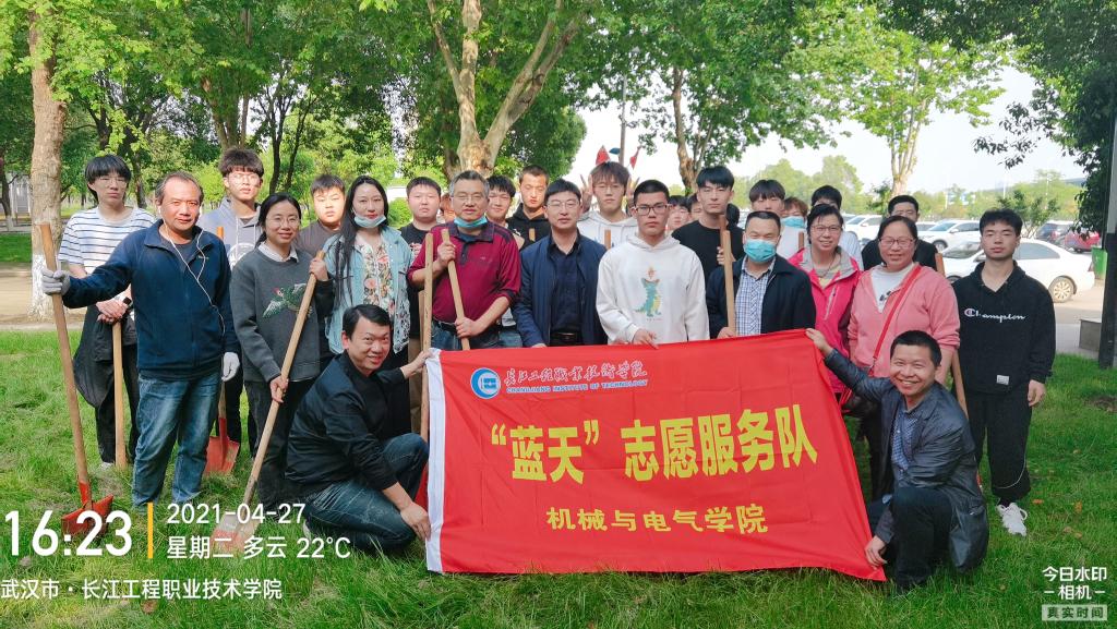 4月27日,机械与电气学院“蓝天”志愿服务队在汇园和润园开展植树活动。学院院长李丰、党总支书记李家坤带领教师志愿者、自动化专业学生参加志愿服务活动。