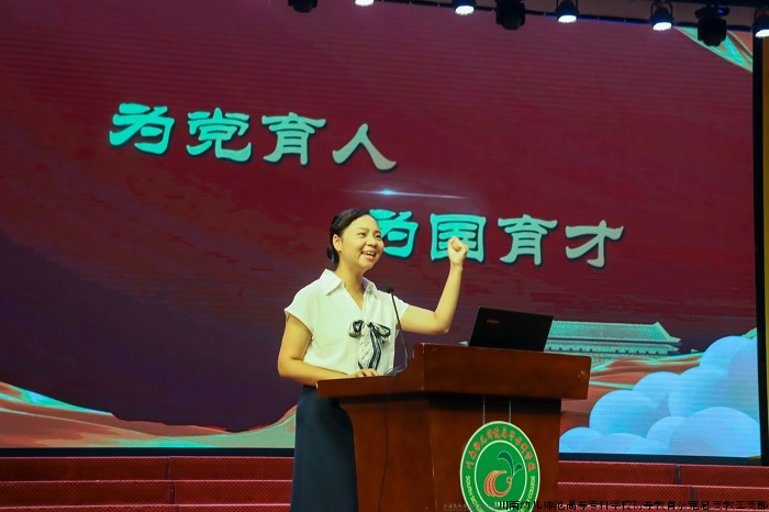 “我以‘两代师表,仁爱笃行’的校训为指引,不断提升政治素养、专业素养,积极参加了2023年四川省职业院校技能大赛,以赛促教、以赛提能,在专业素养上不断精进,这就是对我教育情怀与弘道追求的最好诠释。”“从教21年来,我不断夯实专业基础、提升教育教学水平,涵养育人智慧,练就育人本领。我在专业课教学中多途径、多形式巧妙融入课程思政,通过朗诵、演讲、讲故事等形式,引导师范生形成正确的价值追求、科学的思维方法,扣好人生的第一颗扣子。”内江市“甜城英才”、学前教育学院副院长、四川省职业院校教师教学能力大赛一等奖获得者李欣霖老师和全国通用语言文字推广普及先进个人、学前语言教研室主任刘雯老师分别讲述了自己在教育战线上的奋斗历程,从不同角度阐述了对教育家精神的理解,表达了自己对教育事业的热爱和对学生的深厚情谊,进一步激发了广大教师树立“躬耕教坛、强国有我”的志向和抱负,弘扬尊师重教、共兴尊师风尚。