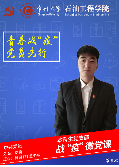 我是刘腾,是石油工程学院的一名大三学生,既是一名退役大学生士兵,也是一名光荣的中共预备党员。2020年的新春佳节与以往春节都不一样,新型冠状病毒引发的肺炎疫情封锁住了武汉,围困住了湖北,牵动着全国上下。在爆竹声震响高天时,我们少了欢笑,多了些忧思,牵挂着奋战在楚天荆襄一线的医护人员。这是一场全国人民的战役,是一场没有硝烟的战争,是一曲彰显民族精神的高亢凯歌……