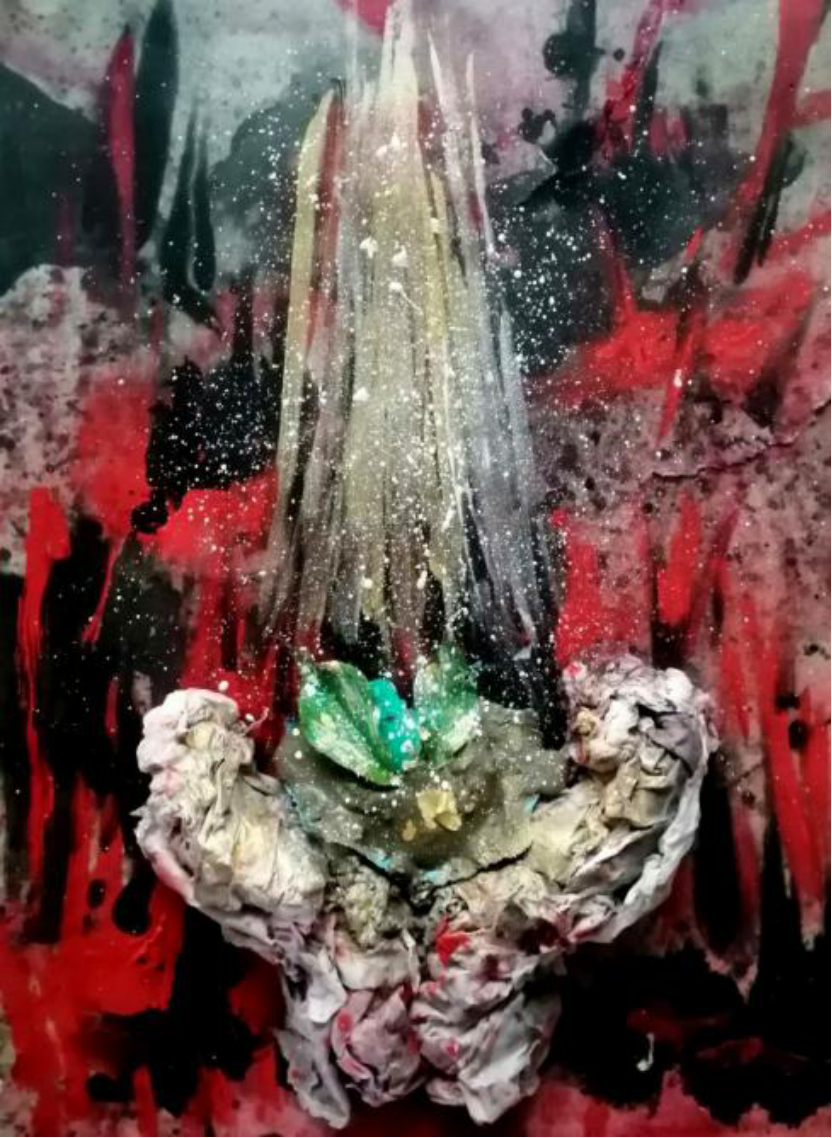 这段综合材料课,因为疫情的原因,只能在家里面度过,我画的这个作品也是关于疫情方面的,我先用淡墨色喷溅,然后用黑色和红色打底来表现疫情的惨烈,之后我用卫生纸和宣纸堆积了一个白衣天使的手,上面加了一些黑色和红色来表现血污,我把口罩铺在手上并放了些泥土,然后插上了一个绿叶,最后用金粉和银粉和白色画出了光束且撒了一些金点照在绿叶上,来表现对未来的希望。