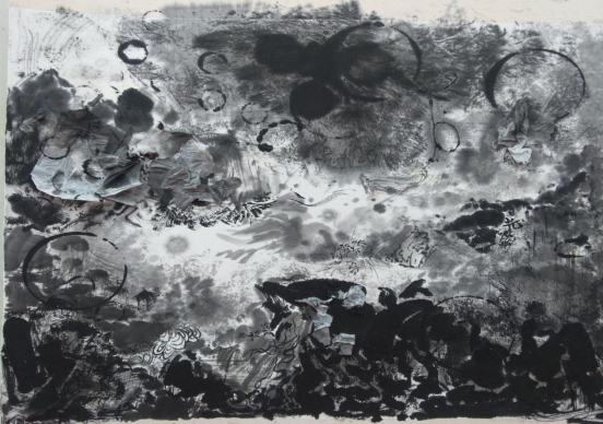 左智飞:用点墨、皴擦、拓印、粘贴等手法表现画面的丰富感和整体性,以大山为画面的基础,用那些延绵不绝的雾来代表希望,用线来装饰画面从而体现画面的丰富感和趣味性。