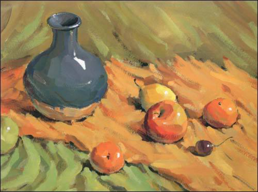 通过油画色彩课的学习,我深刻地感受到了色彩不是照抄眼中所看到的事物的颜色,而是需要经过自己的处理,让画面达到最佳效果。而且所描绘的颜色不是平面的,是附着在物体上的,有颜色丰富变化的。