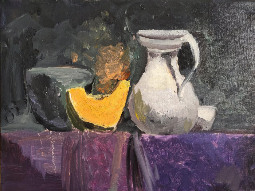 面对一场突如其来的疫情, 本该在学校的我们在王宏宇老师的指导下完成了油画静物作业,通过王宏宇老师的指导下写生色彩要求画者的能力有一种综合的倾向:既要尊重客观对象,又要考虑画者的主观感受;既要强调客观对象固有色与形体的合理性,又要表达出受光线和环境影响所体现出的色彩空间变化,通过油画的静物写生训练我了解到油画材料与水彩颜料的本质区别,与画法上的差异通过这次学习我学到了很多。