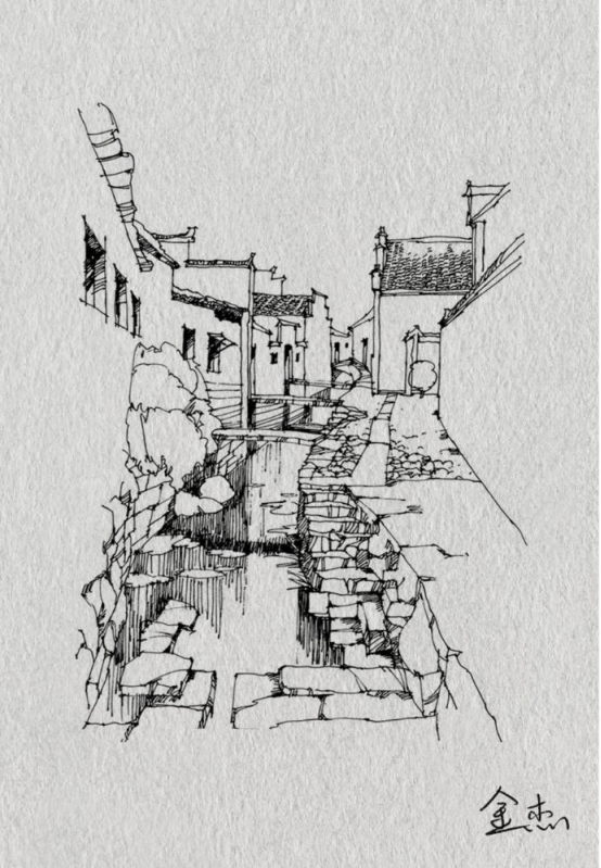 金杰:在风景速写训练中,我进一步体会到处理好画面中形态与构图的关系的重要性,形态当然是经过了有意识的处理。形态的明确体现,是展示自己在风景速写写生中也能清晰地表现出对大自然造型的准确把握。