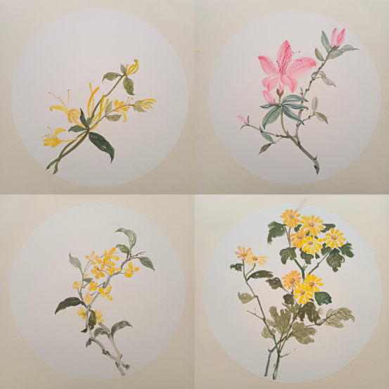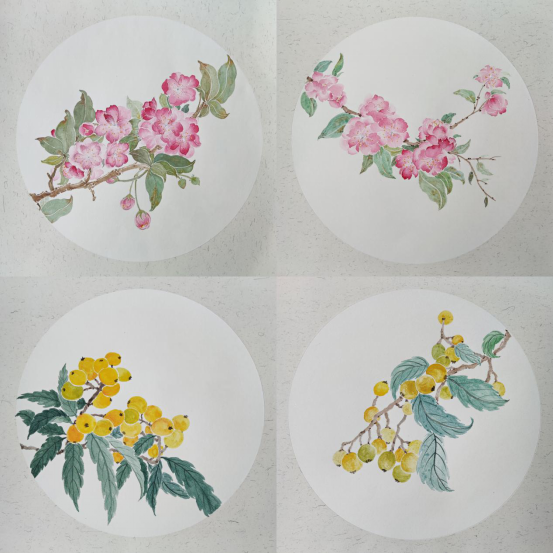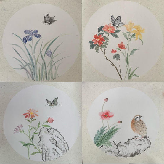 第三周课程:通过对手卷册页创作的实践教学,解决花鸟画在手卷册页创作中的笔墨规律及主题设计,掌握手卷册页创作的整体创作思路。利用勾线笔、染色笔、墨汁、宣纸、调色碟、笔洗、手卷册页画册等教学用具进行手卷册页创作实践。
