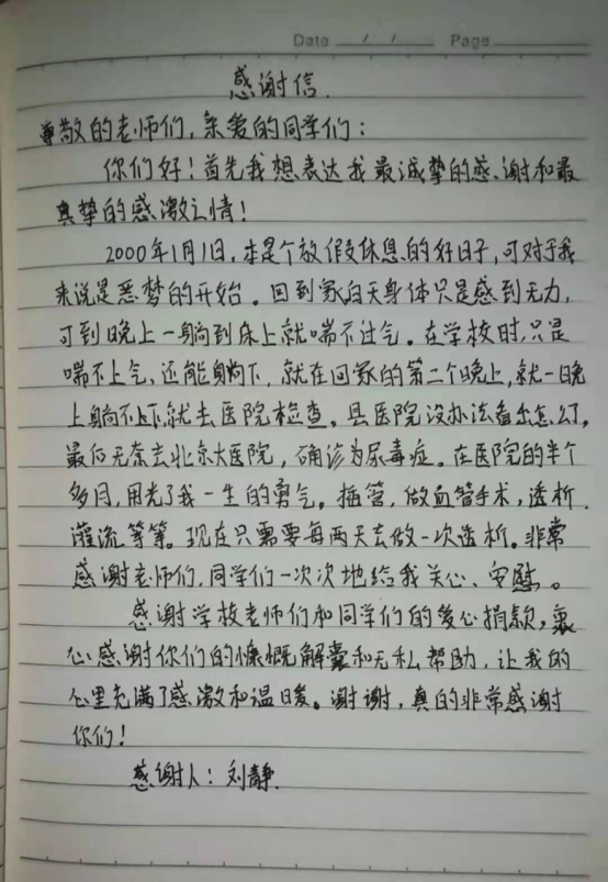 刘静同学的感谢信