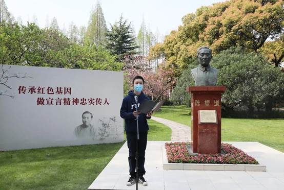“100年前的4月,陈望道老校长完成了《共产党宣言》的翻译工作,100年后的今天,我们倡议:传承红色基因,做‘宣言精神’忠实传人!”活动中,学生代表发起“传承红色基因,做宣言精神忠实传人”倡议,号召复旦大学全体学生共产党员熟读精思《宣言》,掌握马克思主义真理力量;铭记源头初心,坚定马克思主义崇高信仰;秉持人民立场,练就服务人民的过硬本领;争做时代先锋,续写复旦青年的崭新篇章。师生们表示,要把陈望道老校长翻译宣言的故事代代讲下去,不断重温老校长翻译宣言的壮阔历程,学习老校长的崇高精神,汲取“不忘初心、牢记使命”的力量,在新时代进一步诠释弘扬复旦人“团结、服务、牺牲”的精神,更加自觉地做宣言精神的忠实的传承人。