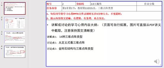 30位学生5人一组,双周在线课堂上,每组都要做好PPT,针对老师提前选好的知识点,进行学习心得汇报,将自己的理解以及对重点的提炼,阐释给老师和同学,这是《半导体物理(混合式教学)》的一大特色。