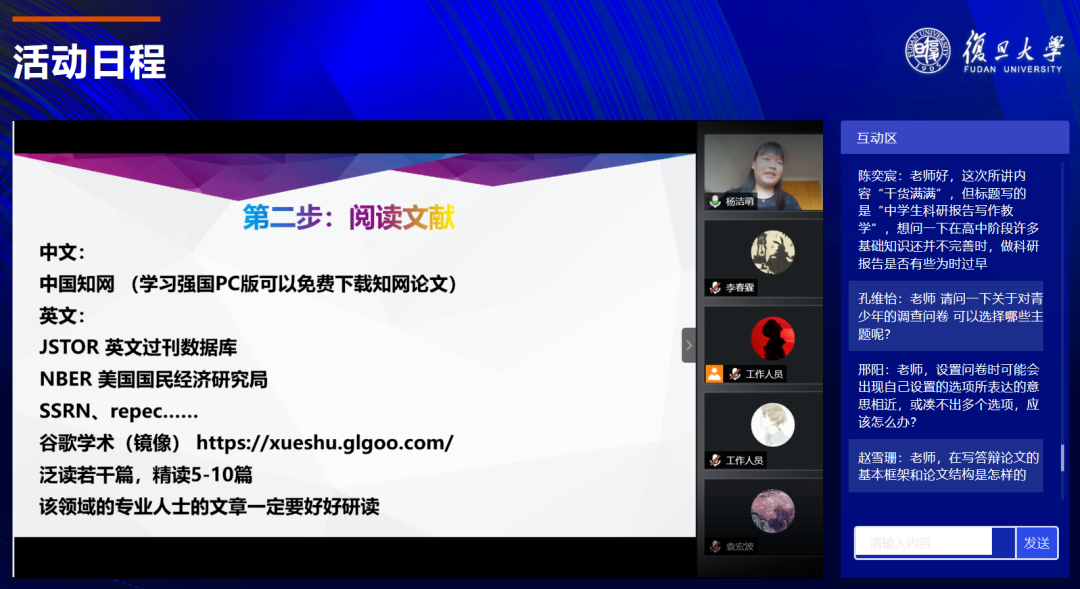 由复旦大学博士生讲师团的杨洁萌老师带来的“中学生科研报告写作教学”专题课程,面向中学生群体,介绍了科研的步骤,引导营员们体会选题研究、问卷设计与报告撰写的技巧。