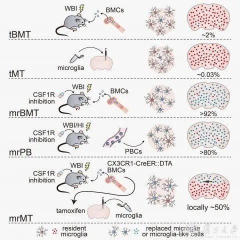 近日,脑科学转化研究院研究员彭勃课题组以再殖现象为基础,开发了三种用外源性细胞替换原生小胶质细胞的移植方案,并在全CNS范围内实现了高效地细胞替换。8月11日,研究成果在线发表于《细胞研究》(Cell Research)。