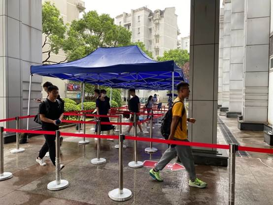 在枫林校区,为确保本次迎新工作顺利开展,上海医学院高度重视,在分管院领导牵头下,提前准备、周密部署,协调各相关职能部门多次召开工作会议,密切配合、落实到位。为统筹常态化疫情管理和教育教学工作要求,针对医科研究生新生报到集中的特点,今年首次启用游泳馆西侧连廊作为报到现场,半开放式空间既保证了通风,又避免了雨水对新生报到的影响。充足的报到空间、合理的报到流程,保证了各研究生培养单位以及相关职能部处清晰划分接待站点,新生报到工作安全有序、顺利开展。