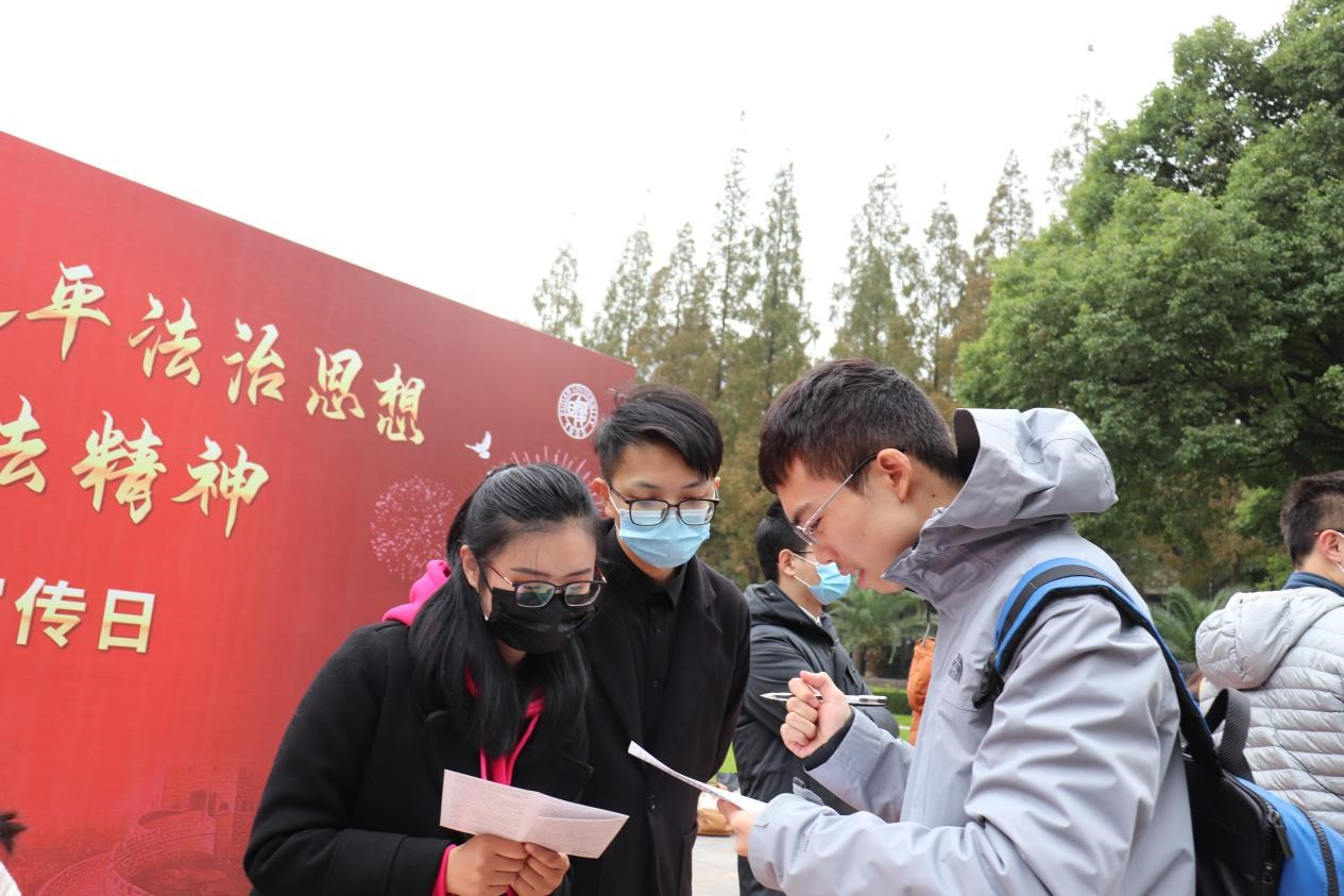 全民的法治信仰和法治观念,是依法治国的内在动力,更是建设法治中国的精神支撑。为深入学习和落实习近平法治思想,普及法律知识,弘扬法治精神,法学院2019级法律硕士(非法学)第四党支部于宪法日当天开展主题党日活动,在宪法行政法党支部教师王蔚、涂云新的指导下,联合上海市虹口区劳动仲裁员代表开展校园普法宣传。校党委书记焦扬、党委副书记金海燕现场慰问支部普法人员。