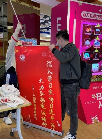 为深入学习宣传习近平法治思想、大力弘扬法治精神,在第七个国家宪法日之际,法学院2019级法律硕士(非法学)第二、第三党支部与学生法律援助中心联合新江湾城司法所、平安办在新江湾城悠方购物生活广场建立街校合作平台,开展普法宣传志愿服务活动,为将法治思想和宪法精神融入人民生活日常贡献青年力量。